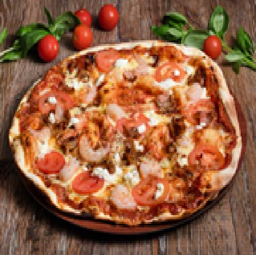 Available only during 10:00 am - 10:00 am- LOFN - GODDESS OF FORBIDDEN LOVESTomato Base, Oregano, Garlic Marinated Prawns, Feta Cheese, Baby Spinach, Semi Dried Tomatoes And Home Made Basil Pesto
